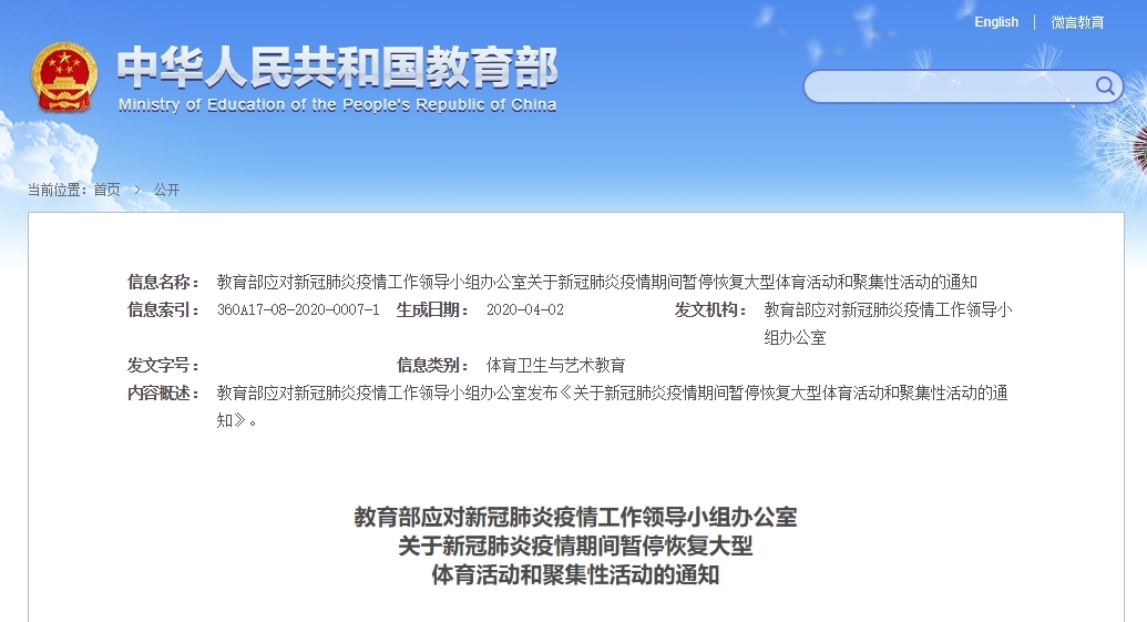为减少人员聚集和流动给疫情防控带来的风险,新冠肺炎疫情期间暂停恢复学校体育单项赛事、综合性运动会等大型体育活动和聚集性活动。各地各校要坚持审慎原则,完善有关组织和工作机制,提前谋划相关活动预案,做好活动赛期等调整工作。
